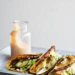 - Tag tortillas af panden, og top med det øvrige fyld og dressingen.