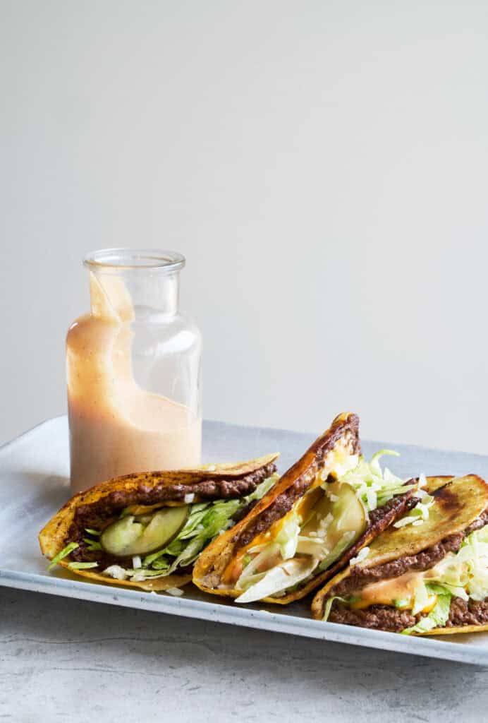 Dressingen er hjertet i disse cheeseburger tacos og trækker tydelig inspiration fra den ikoniske Big Mac-dressing (jeg er ærligt talt ikke meget for at indrømme det, men jeg elsker den og bestiller gerne min Bic Mac med ekstra dressing). Min version af Bic Mac-dressing består af en base af mayonnaise, ketchup og sennep kombineres med finthakkede syltede agurker, tomatpuré og krydderier, som tilsammen giver den helt rigtige balance mellem syrligt, sødt og krydret. Når dressingen får lov at trække på køl, samler smagene sig og bliver endnu mere intense.