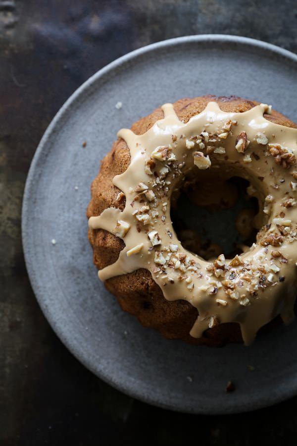 Det er min tredje opskrift med kaffe i (tag også et kig på min thailanske iskaffe eller den italienske dessertklassiker affogato). Jeg vil vove at påstå, at i modsætning til de to foregående opskrifter, så vil selv kaffeskeptikere kunne finde på at tage to gange fra fadet, hvis du stiller kaffekagen her foran dem. Smagen af kaffe er nemlig dejligt diskret, men du bestemmer selv, om du vil skrue op eller ned for kaffesmagen. Må den gerne være meget tydelig, så brygger du en rigtig stærk kop kaffe, som du tilsætter en teskefuld instantkaffe. For en mere allround kage, som også kan serveres for børn, vil jeg dog nøjes med en almindelig kop stærkbrygget kaffe. Jeg har også blandet lidt kaffe i selve glasuren, men det er mest for syns skyld.