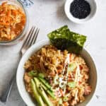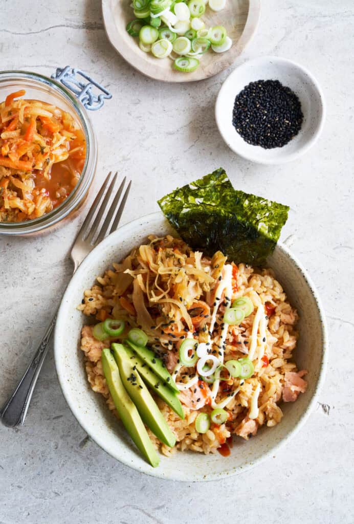 Denne poke bowl med laks, avocado og kimchi – også kendt som salmon rice bowl – er et perfekt eksempel på, hvordan en viral trend kan blive til en fast favorit i hverdagen.